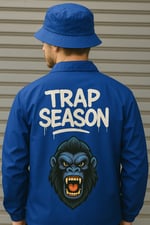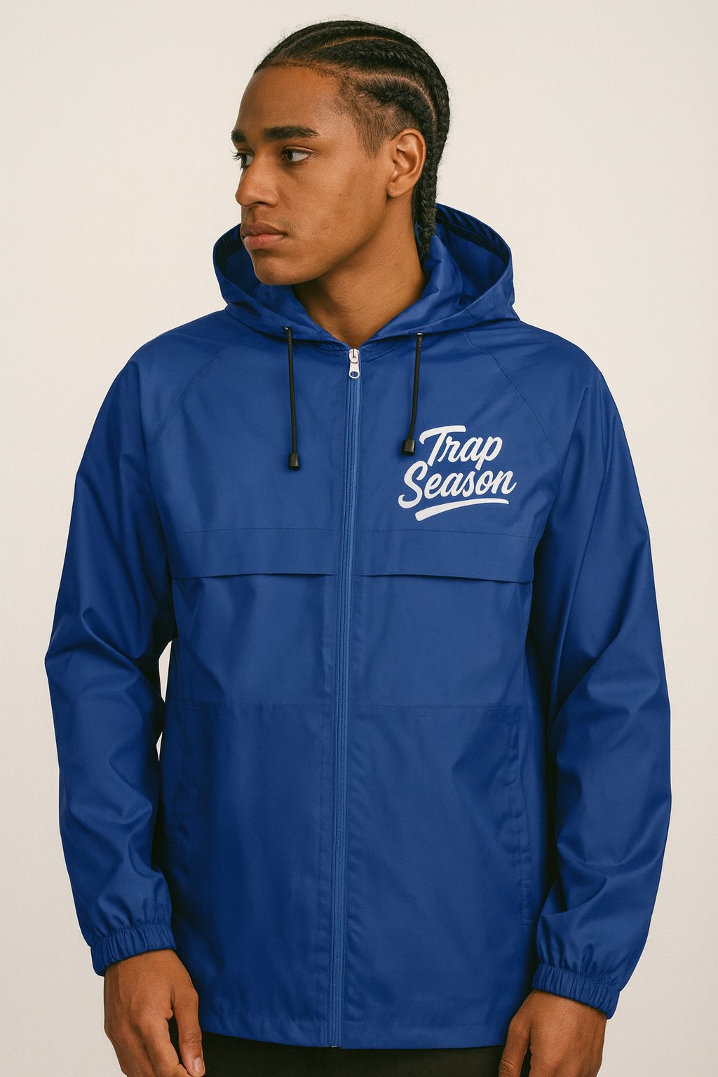 Windbreaker with a hood collar and drawstring for custom fitting, plenty of pockets inside and outside.